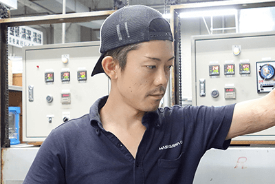 鷹箸正和さん 30代 課長代理 製造業は初めての経験でしたが、機械を動かすにつれてものづくりの魅力に取りつかれました。ここで動かす機械は全てオーダーメイドで作られたもので、世界に一つしかありません。ですから故障した時も何処が壊れているのかを自分たちで探したり、メンテナンスも自分で考える必要があります。大変な作業ですが、自分が機械を操っているんだ、手をかけているんだという充実感があります。また、最近では新しい機械を2年かけて1から組み上げました。全て手探りの状態でしたが、関係会社の方の手助けを借りて、何とか完成させることができました。この達成感は半端ないです。 |