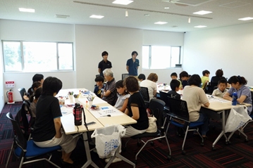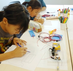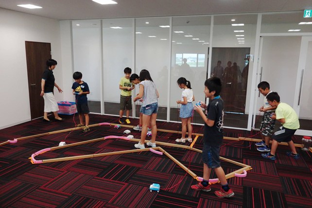 乾電池、モーター、スイッチを使って初歩的な電気の働きを学びながら、親子で自分だけの電動リモコンカーを作り上げます。最後に社内サーキットコースを実際に走らせて競争したり、タイムを計って遊びます。 |